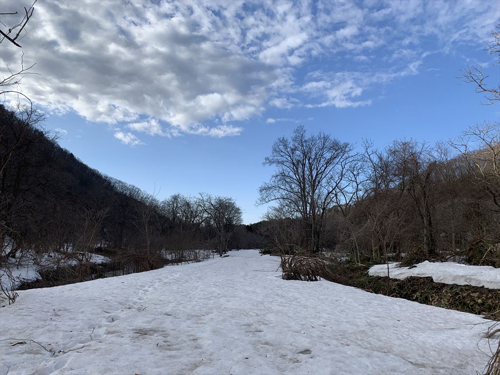 東奥CC通過後に道脇駐輪し残雪道を歩く